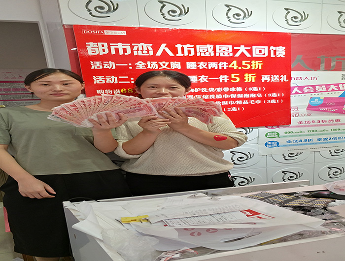 喜报喜报,曹总4店国庆节促销活动业绩高达11338元,店员之间的默契配合,督导的热情喊麦和劲爆的外场吸引了很多顾客,当天以11338元的业绩结束当天活动!!!曹总一直跟随公司的步伐,积极备货,积极要督导来店里做活动,到现在已经拥有5家都市恋人坊了,感谢曹总对公司的信任与支持。