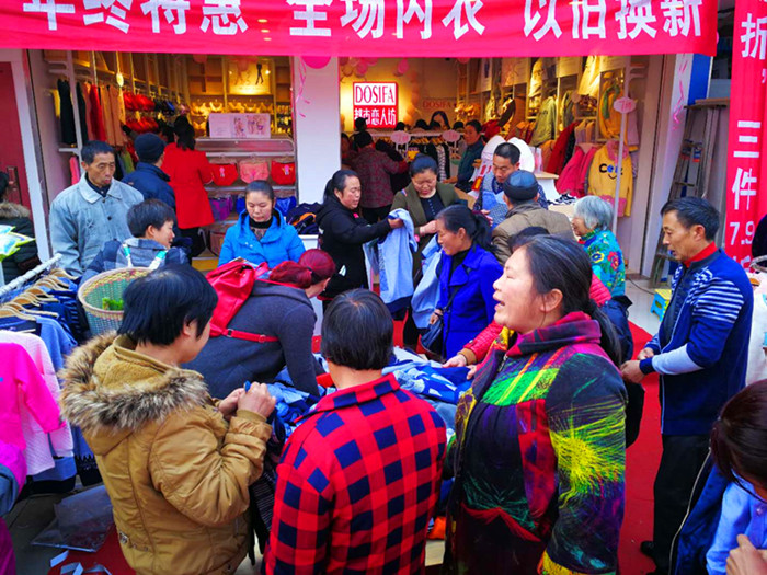 林总自己是做设计的,也有经营一家百货店,还有一家其它品牌的内衣店,关注我们都市恋人坊几年了,终于还是在2018年元月盛大开业了,开业过后生意也是红红火火的,林总店位于乡镇上,但是我们活动当天镇上是不赶集的,当时我们都抱着怀疑的态度不知道能否做到高业绩,可是当天的场面真的出乎我们的意料之外,这边的天气已经开始变热了,可是当天的保暖,夹棉都一如既往的卖得很好,当天的保暖都快卖疯的节奏,所有货品都卖得差不多了,老板自己都说不赶集还能这么好生意真的是想像不到,来来来,接下来让我们一起来看看当天的活爆场面吧!!!