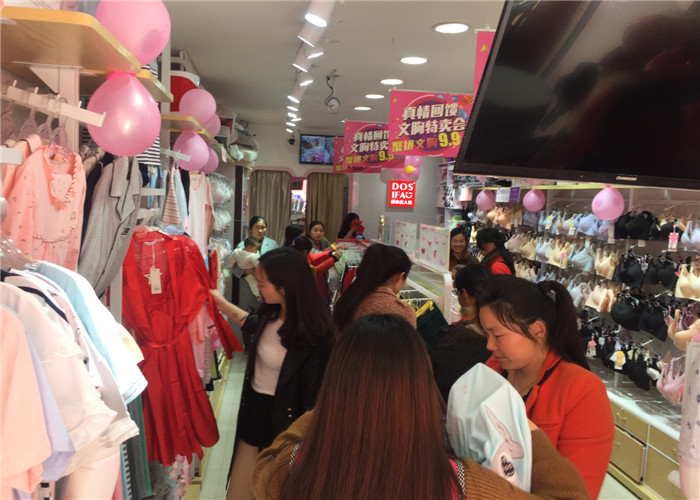 李道峰先生自己经营的产业非常的多,看到了内衣的前景,在了解了都市恋人坊之后,决定加盟都市恋人坊,从加盟以来每天都业绩和每次活动的成功让李先生更加确定了当初做都市恋人坊的决心了,李先生店铺位于当地的商业步行街,当天活动政策是3.8节最后一天的活动,内衣9.9,38元,全场新品9.5会员折扣,内衣两件9折,当天业绩8030元,非常想不到,因为已经过了3.8节了,没想到还能有这么好的业绩,接下来就让我们看一下店铺活动当天的火爆场面