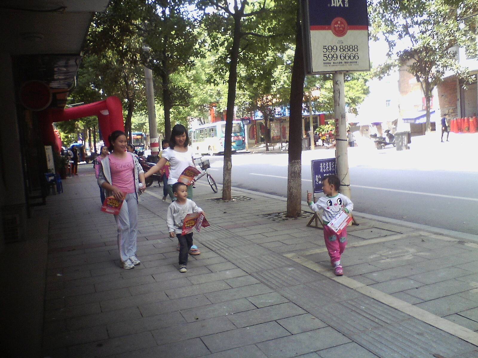 为了抓住早市的人天还没亮我们就开始布置外场,镇上的人并不多,一个早上才做一千多点,到了中午一个人也没有,好不容易看到一个顾客,连我们的小朋友们都抢着去发传单,你看;
