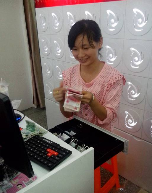 九零后年轻美丽的老板娘,开心的在数钱哟!好多毛爷爷哟