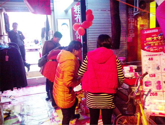 十一月十五号王老板的盛大新店开业啦!在开业的前一天我们来到王老板的店铺,到店就看下我们都惊到了,顶都还没吊货柜也没装,但是一点没影响我们对第二天开业的心情。由于装修师傅都没经验研究半天货柜还是装不好,这会我们的余经理马上加入到装修师傅的行列中帮着装货柜,男人们忙着室内装修的同时我们女人也没闲下来,老板娘我们就在马路边上抽样挂板,当时的温度将接近零度但是没一个人叫冷叫苦,经过一个晚上的努力货都理好了,但里面还没装修好,我们心里那叫一个急,最后经过余经理跟我们装修师傅的连夜奋战到早上六点,货柜总算是完整的立在我们的新店里面,经过大家的一起努力我们在八点钟正式开业了,这个时候居然又停电了,我想考验我们的时候到了,没电我们还是一样的激情饱满,我们就在店门口发传单、发礼品,我们精美的礼品吸引着一批又一批的顾客进店,